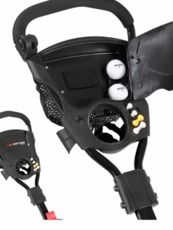Ergonomic grab handle includes a drinks holder, scorecard holder, tee and ball storage space and a storage compartment for other accessories.
